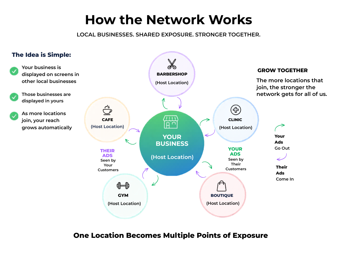Becoming a host location is a low-effort way to add value to your space while participating in a modern local advertising network. It gives your business added visibility, supports a more engaging in-store environment, and creates zero-risk upside through participation in a growing platform.